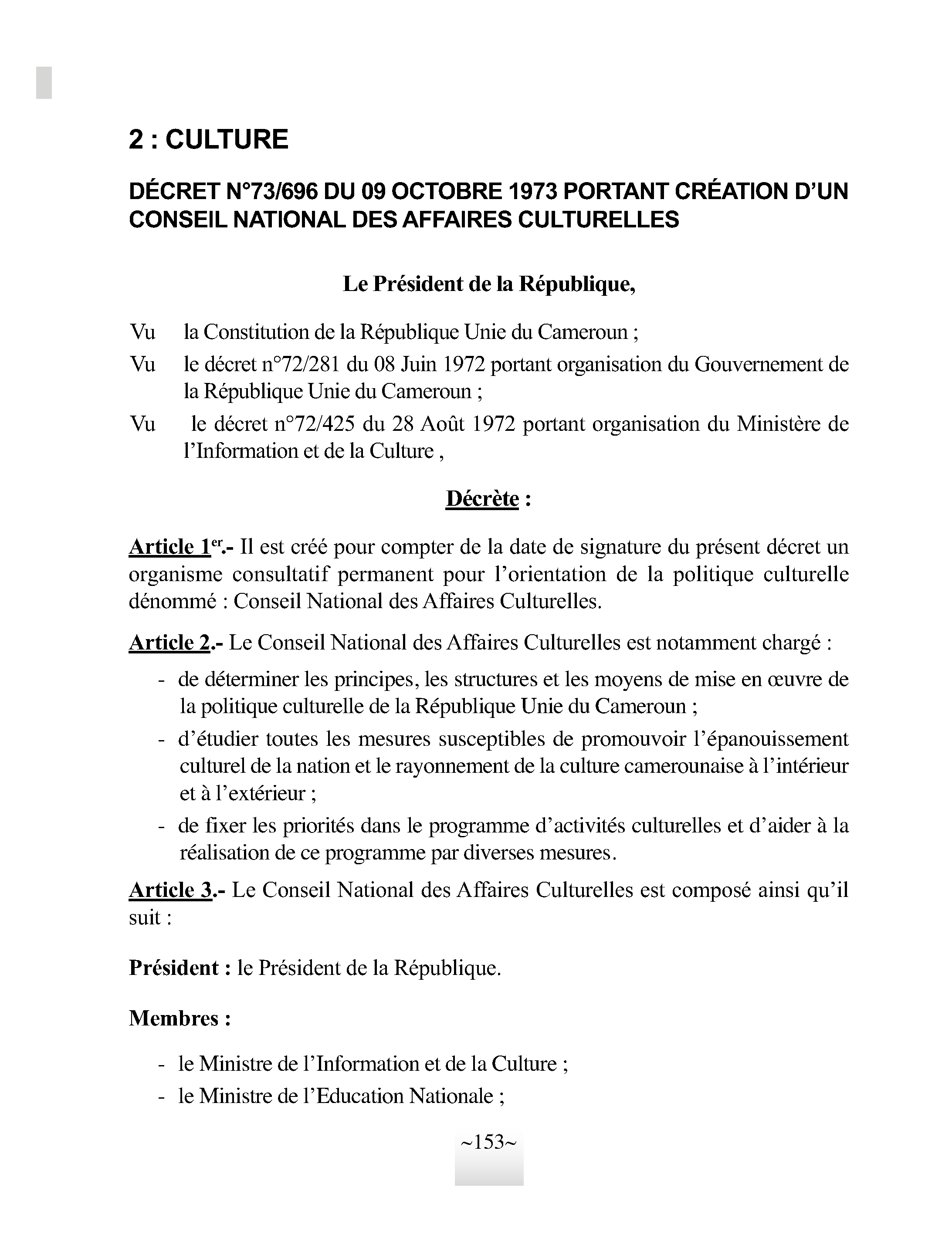 Décret N°73/696 Du 09 Octobre 1973 Portant Création D’un Conseil National Des Affaires Culturelles (1973)