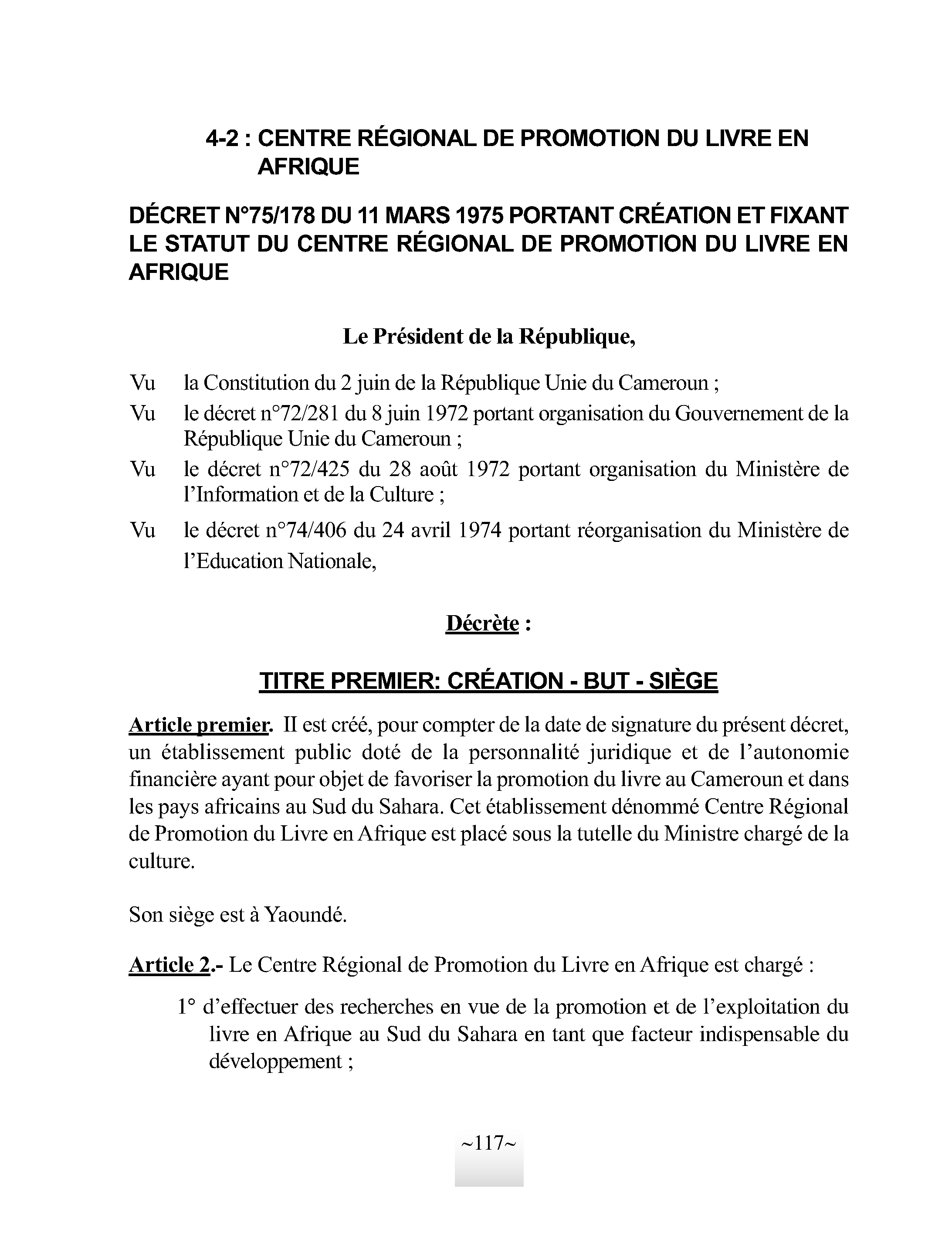 Décret N°75/178 Du 11 Mars 1975 Portant Création Et Fixant Le Statut Du Centre Régional De Promotion Du Livre En Afrique (1975)