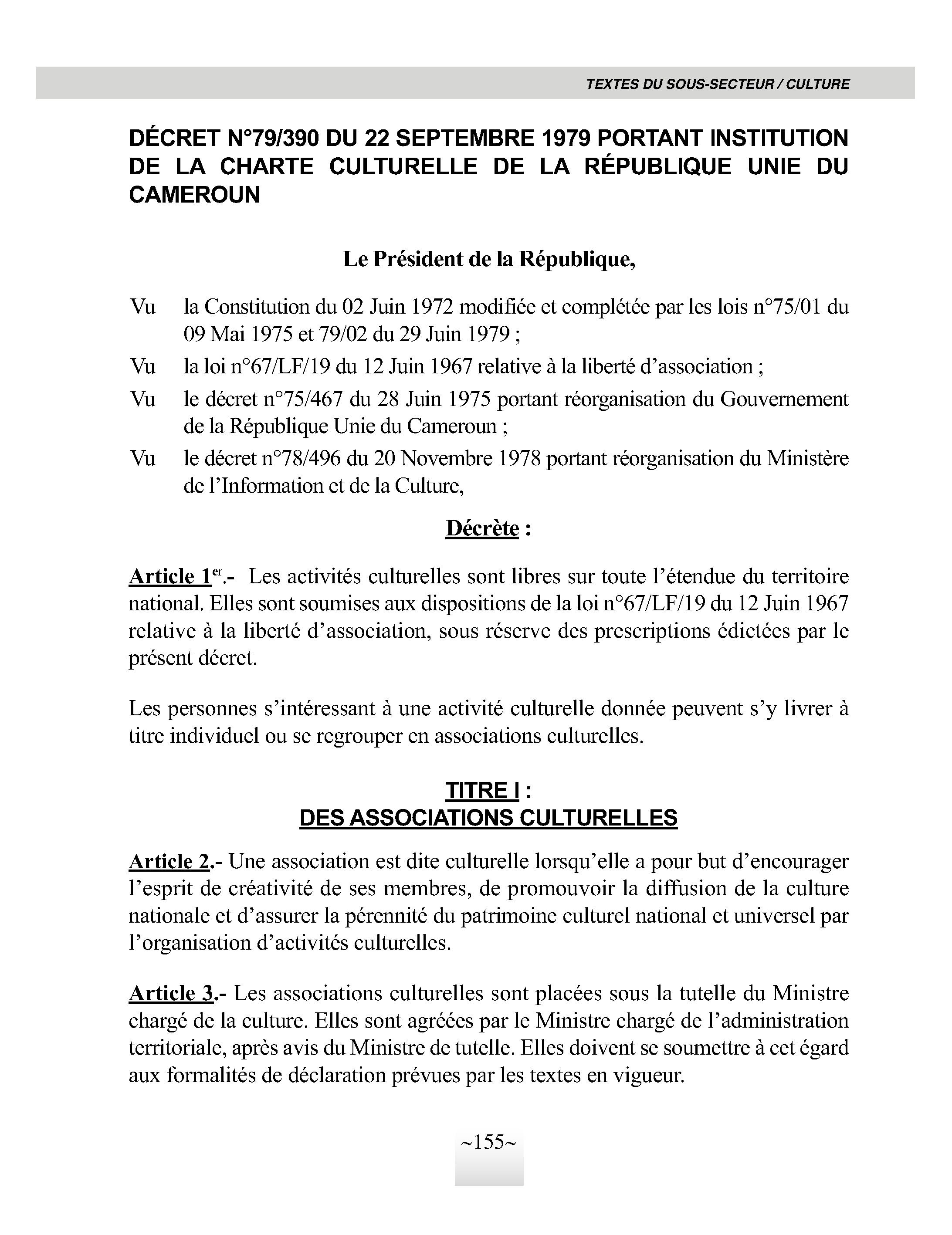 Décret N°79/390 Du 22 Septembre 1979 Portant Institution De La Charte Culturelle De La République Unie Du Cameroun (1979)