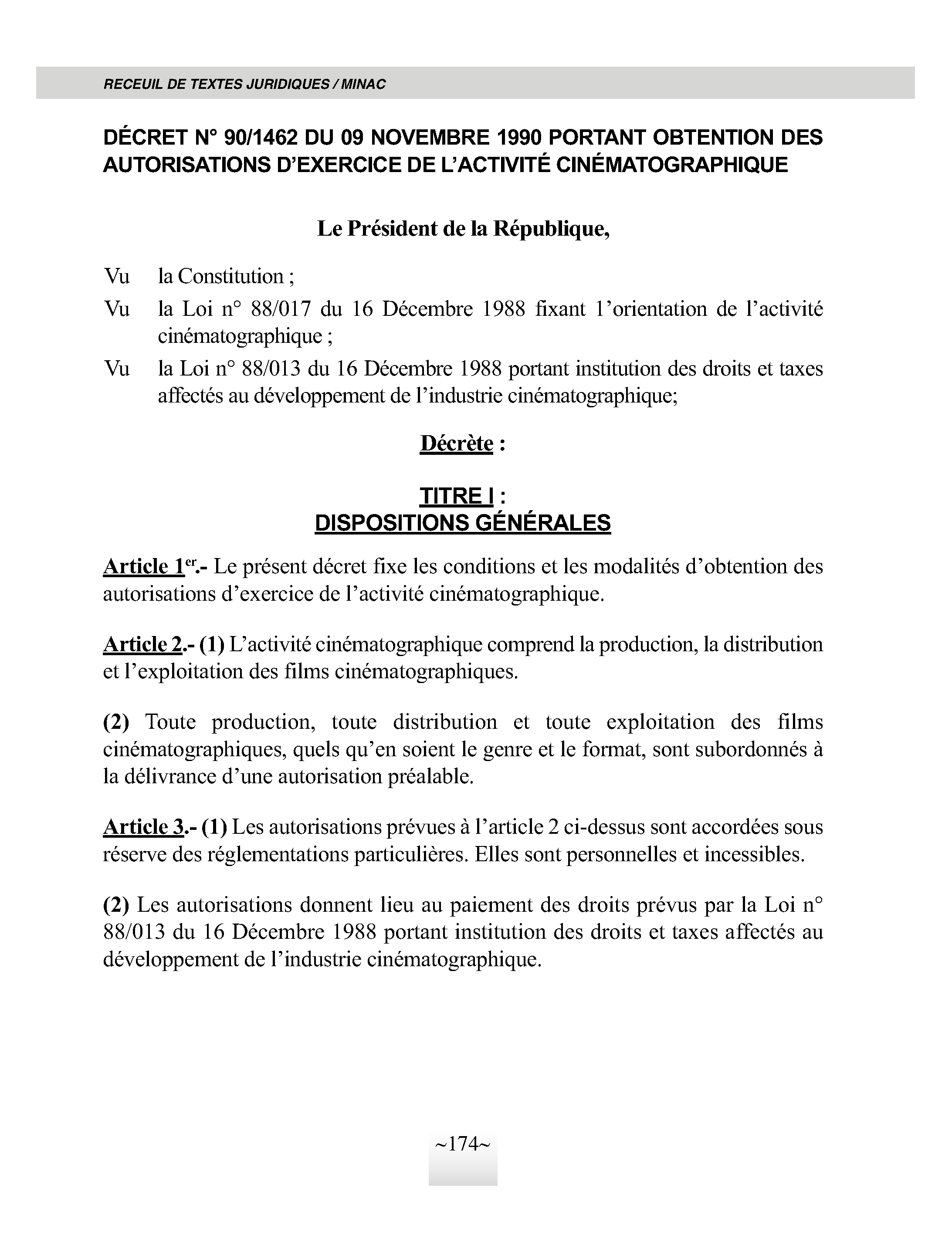 Décret N° 90/1462 Du 09 Novembre 1990 Portant Obtention Des Autorisations D’exercice De L’activité Cinématographique (1990)