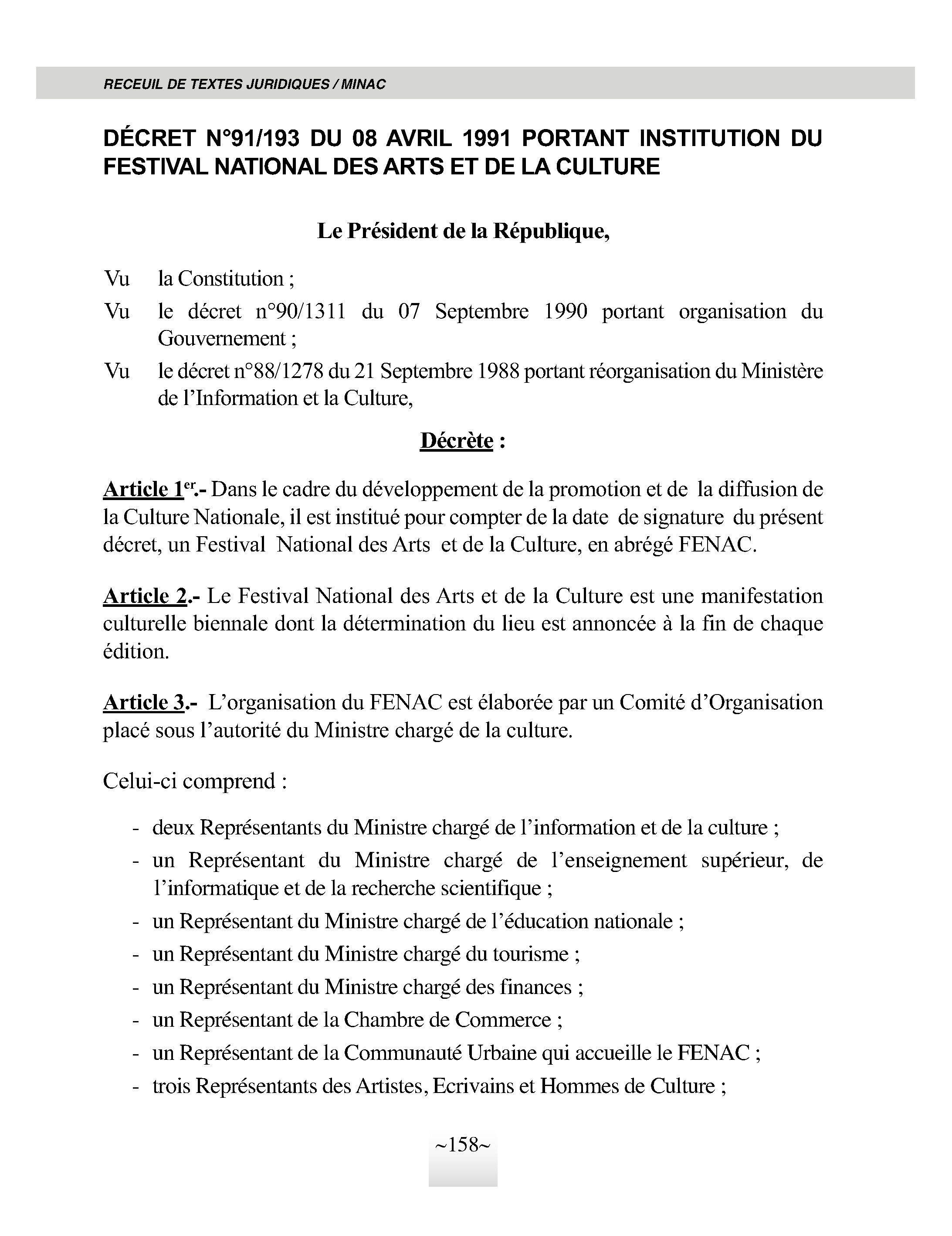 Décret N°91/193 Du 08 Avril 1991 Portant Institution Du Festival National Des Arts Et De La Culture (1991)
