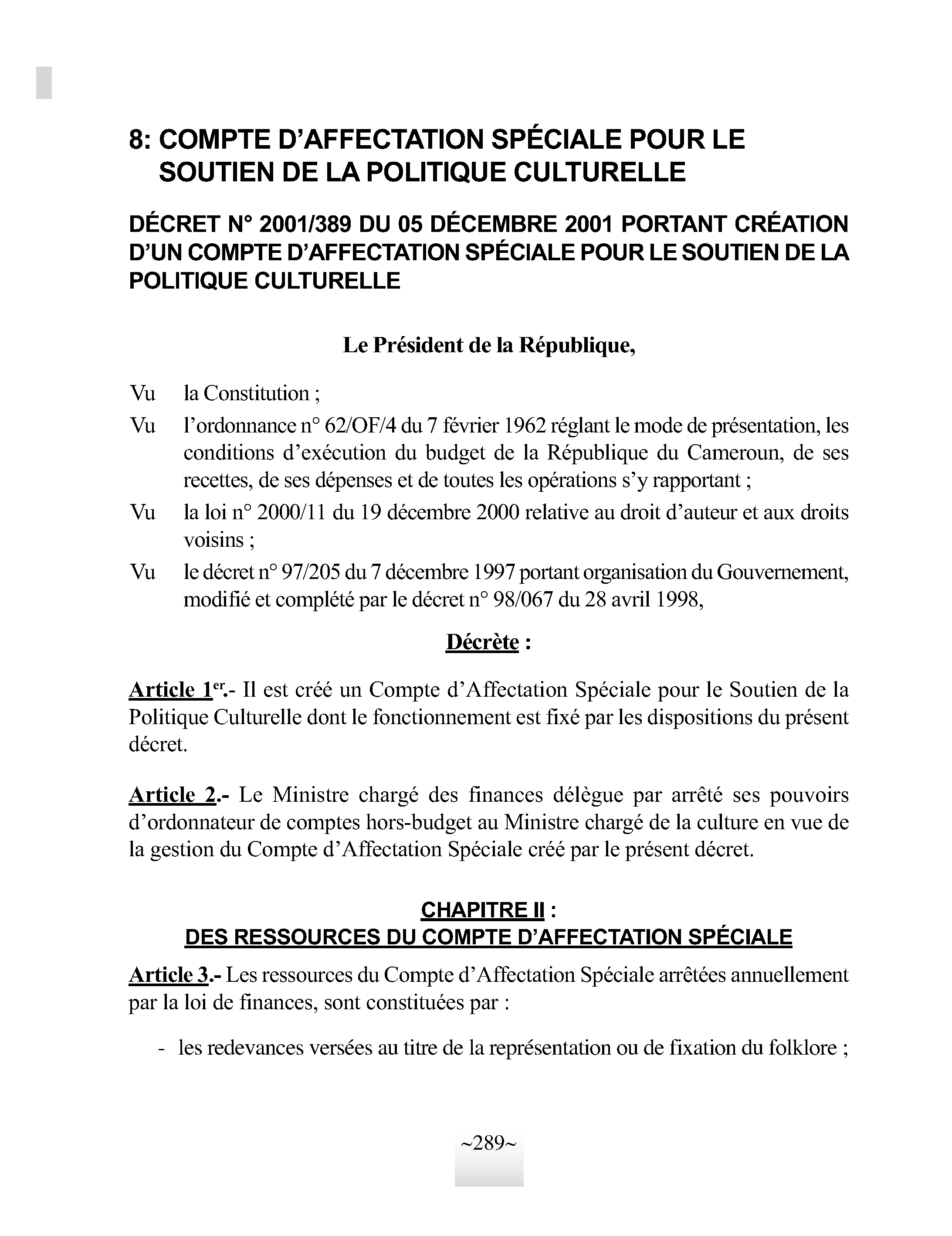 Décret N° 2001/389 Du 05 Décembre 2001 Portant Création D’un Compte D’affectation Spéciale Pour Le Soutien De La Politique Culturelle (2001)