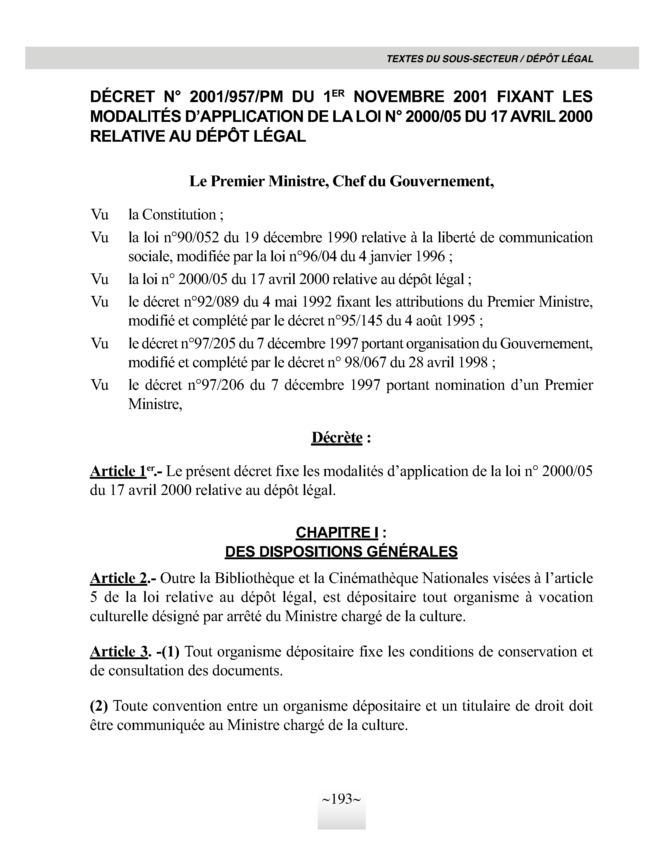 Décret N° 2001/957/Pm Du 1Er Novembre 2001 Fixant Les Modalités D’application De La Loi N° 2000/05 Du 17 Avril 2000 Relative Au Dépôt Légal (2001)