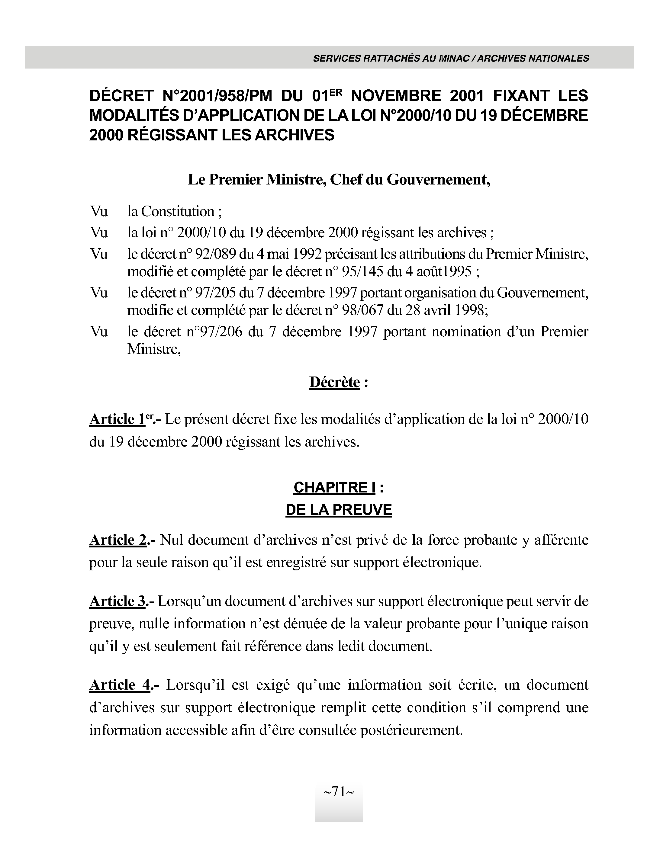 Décret N°2001/958/Pm Du 01Er Novembre 2001 Fixant Les Modalités D’application De La Loi N°2000/10 Du 19 Décembre 2000 Régissant Les Archives (2001)