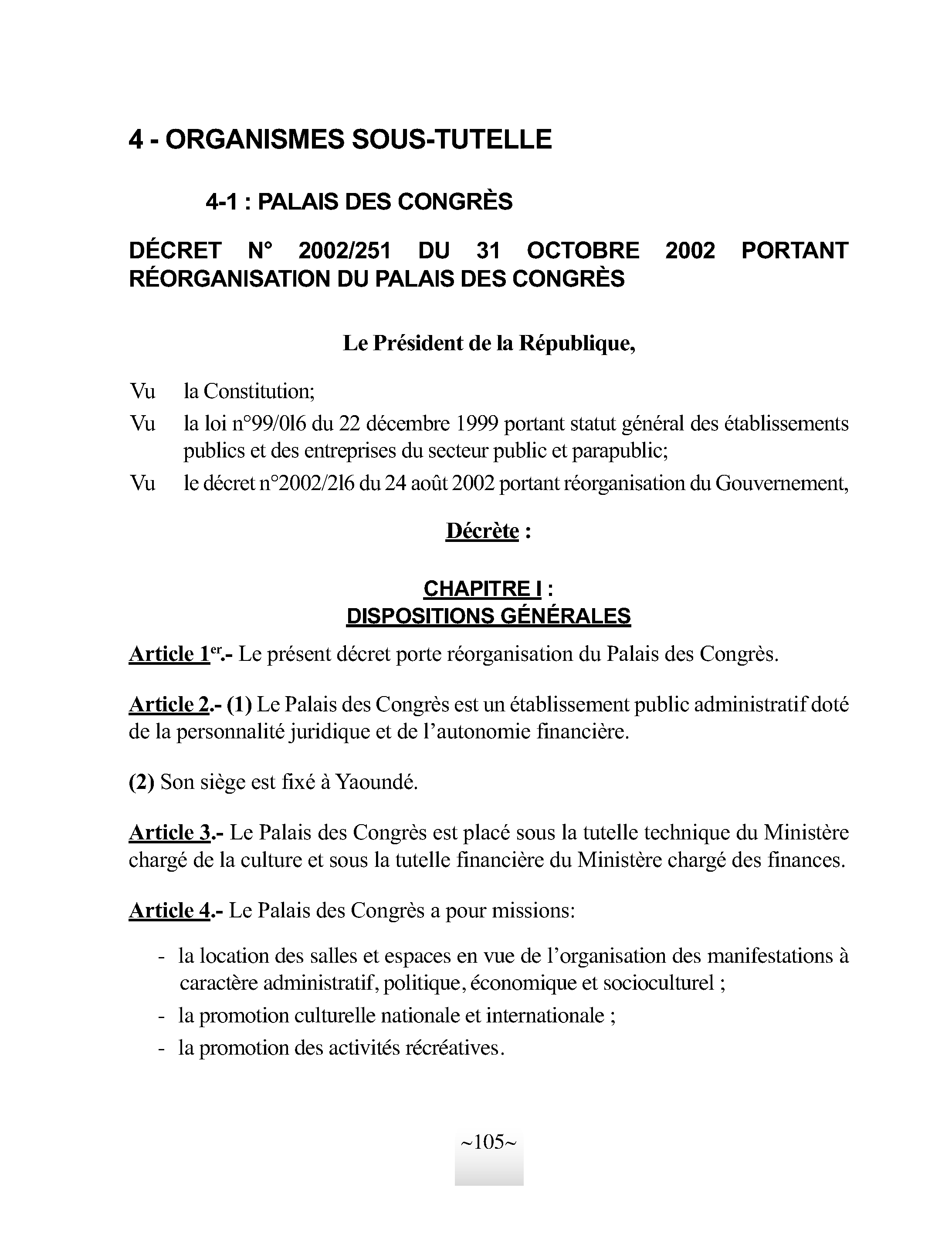 Décret N° 2002/251 Du 31 Octobre 2002 Portant Réorganisation Du Palais Des Congrès (2002)