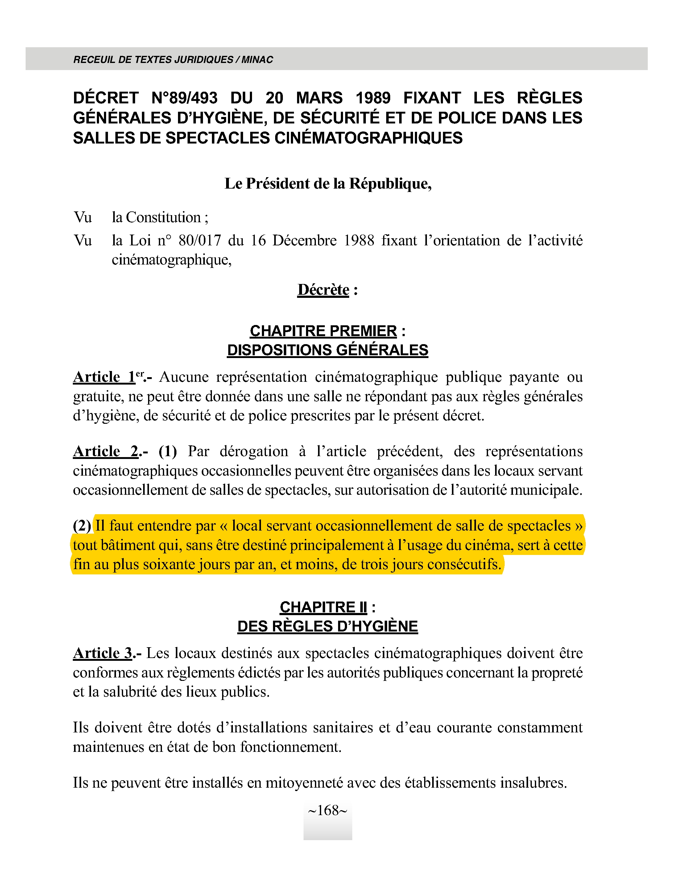 Décret N°89/493 Du 20 Mars 1989 Fixant Les Règles Générales D’hygiène, De Sécurité Et De Police Dans Les Salles De Spectacles Cinématographiques (1989)