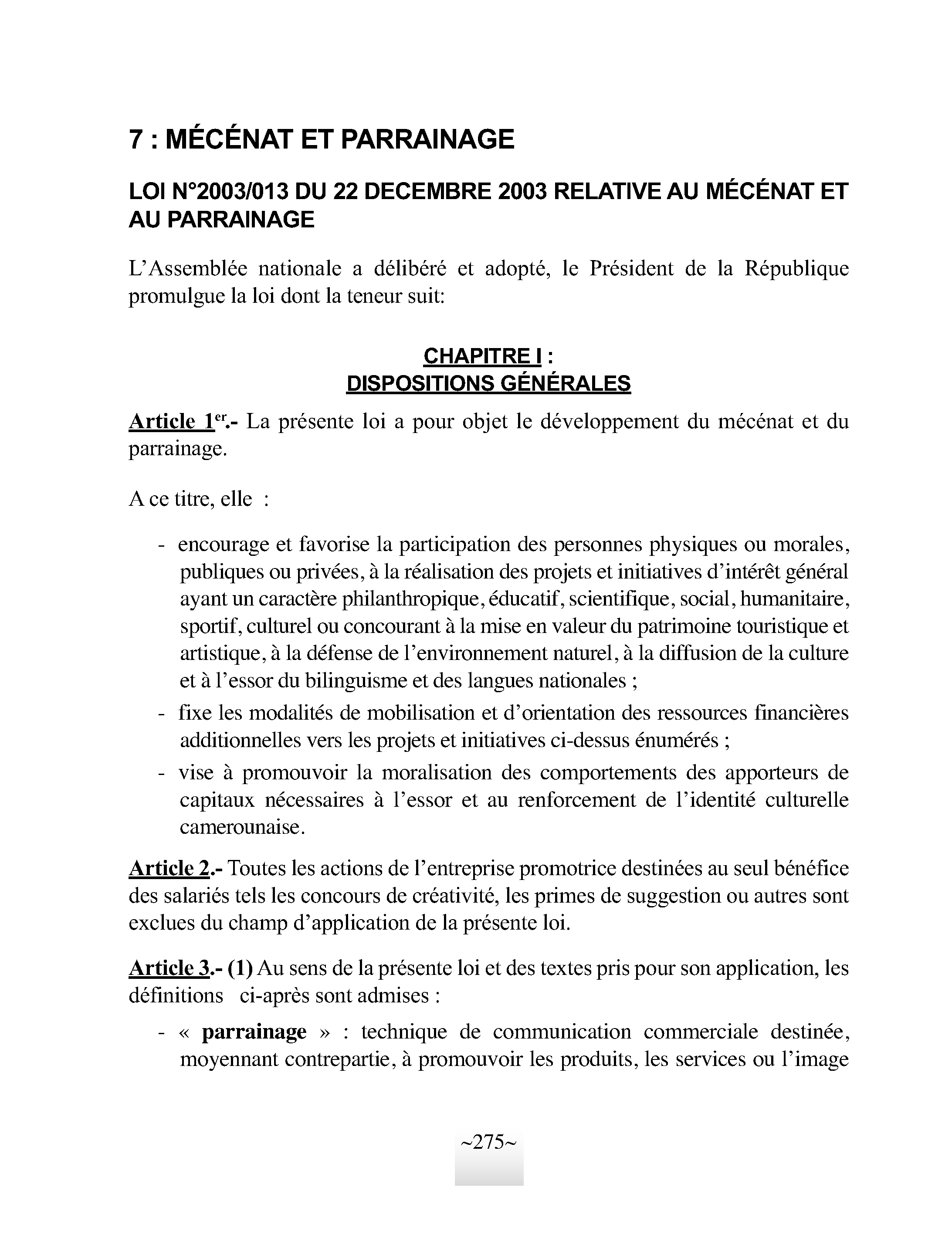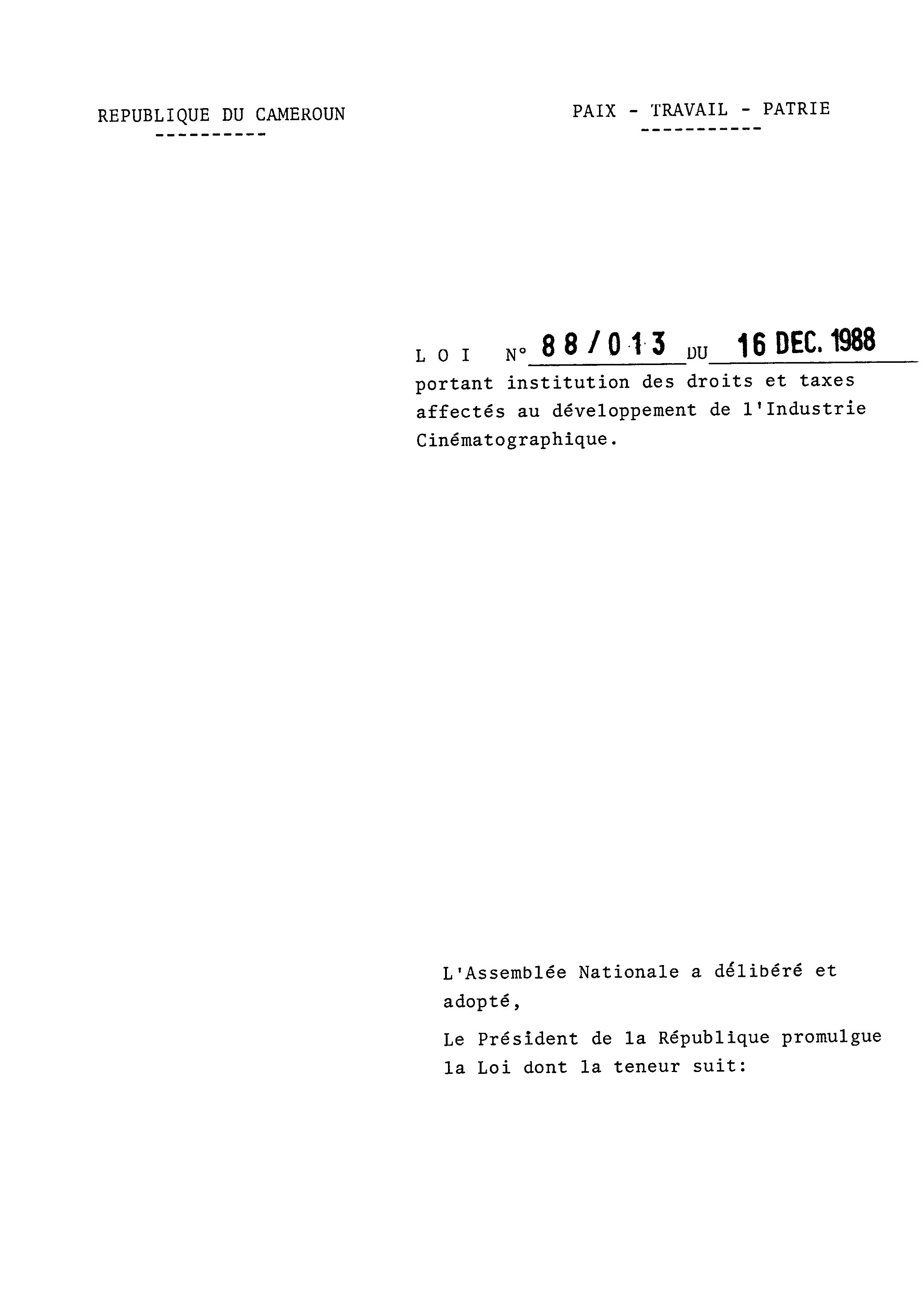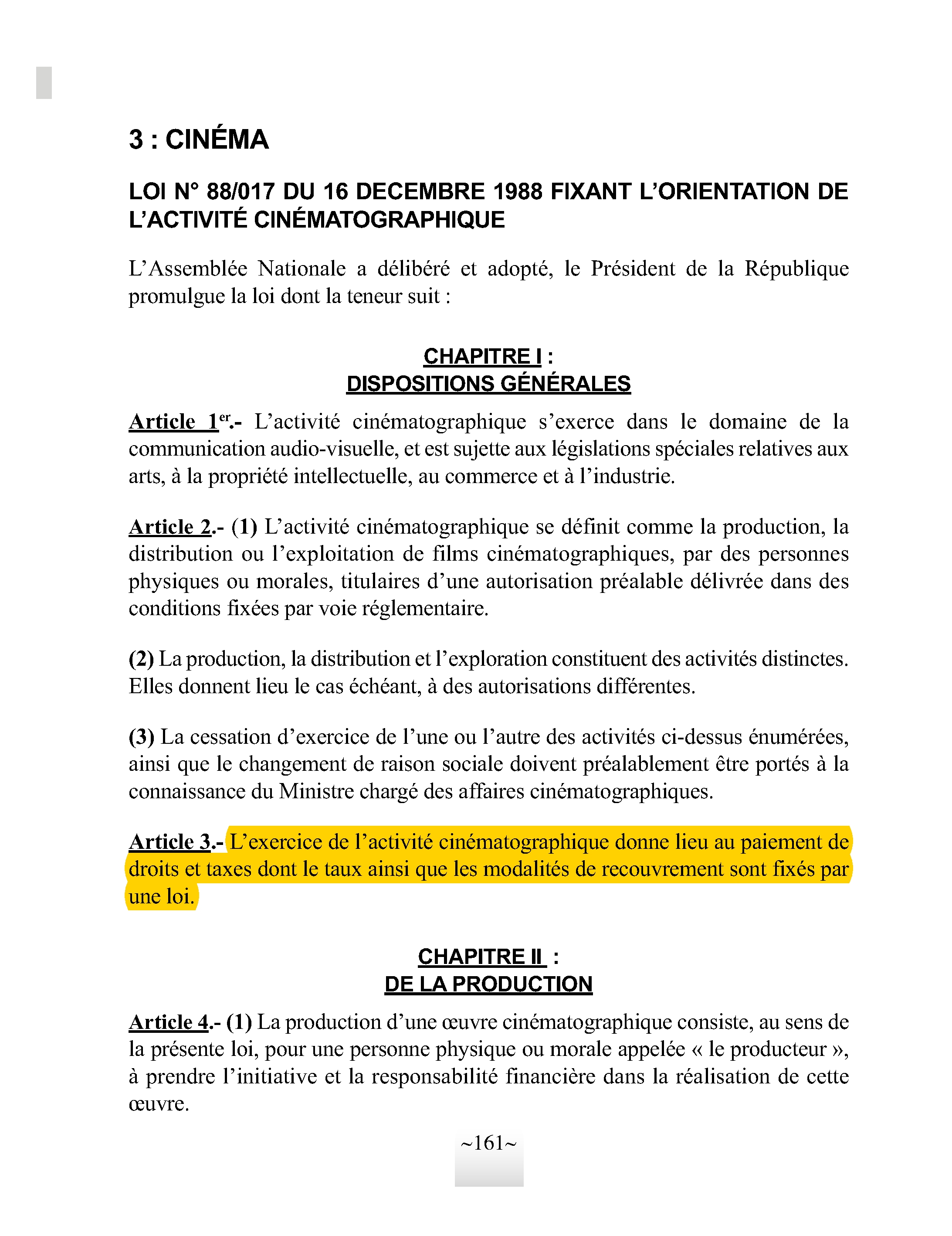 Vu la Loi n° 88/013 du 16 Décembre 1988 portant institution des droits et taxes affectés au développement de l’industrie cinématographique;