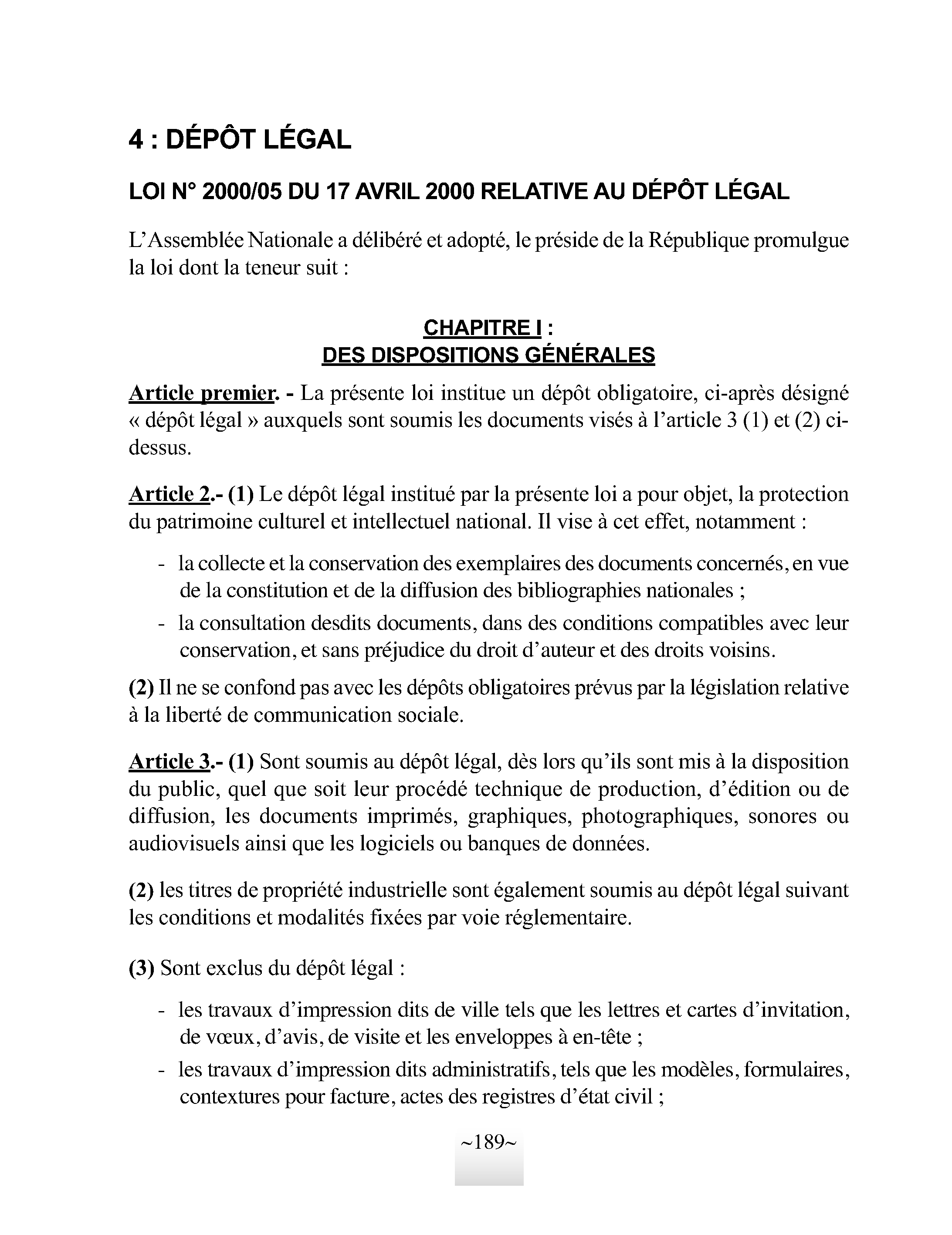 Vu la loi n° 2000/05 du 17 avril 2000 relative au dépôt légal ;