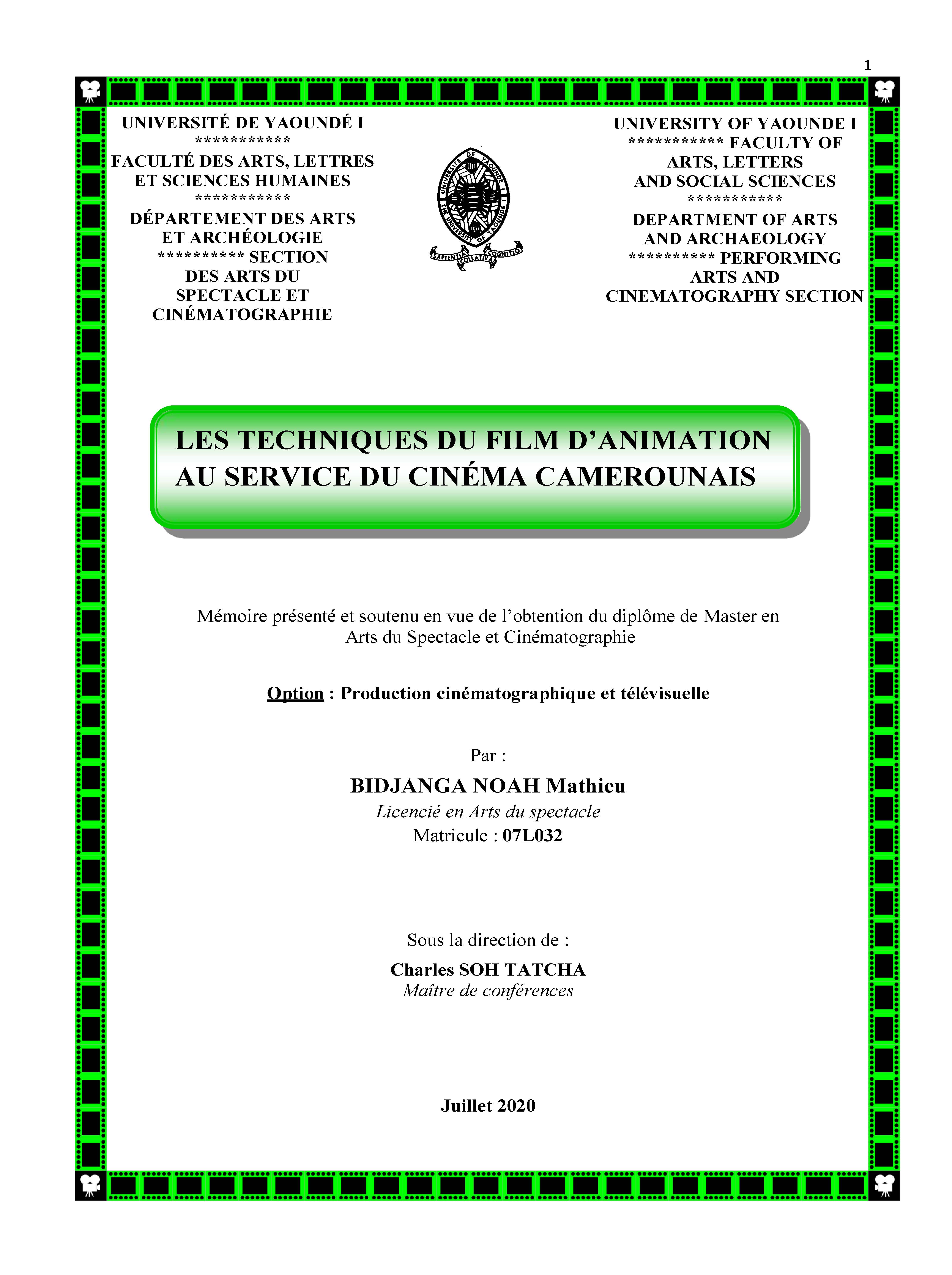 C‟est dans cet élan de voir émerger un cinéma d'animation camerounais aux multiples facettes et avec un public toujours demandeur que nous avons voulu rendre compte dans ce mémoire de cette évolution positive à même d‟ouvrir de nouveaux horizons à l‟industrie cinématographique camerounaise.