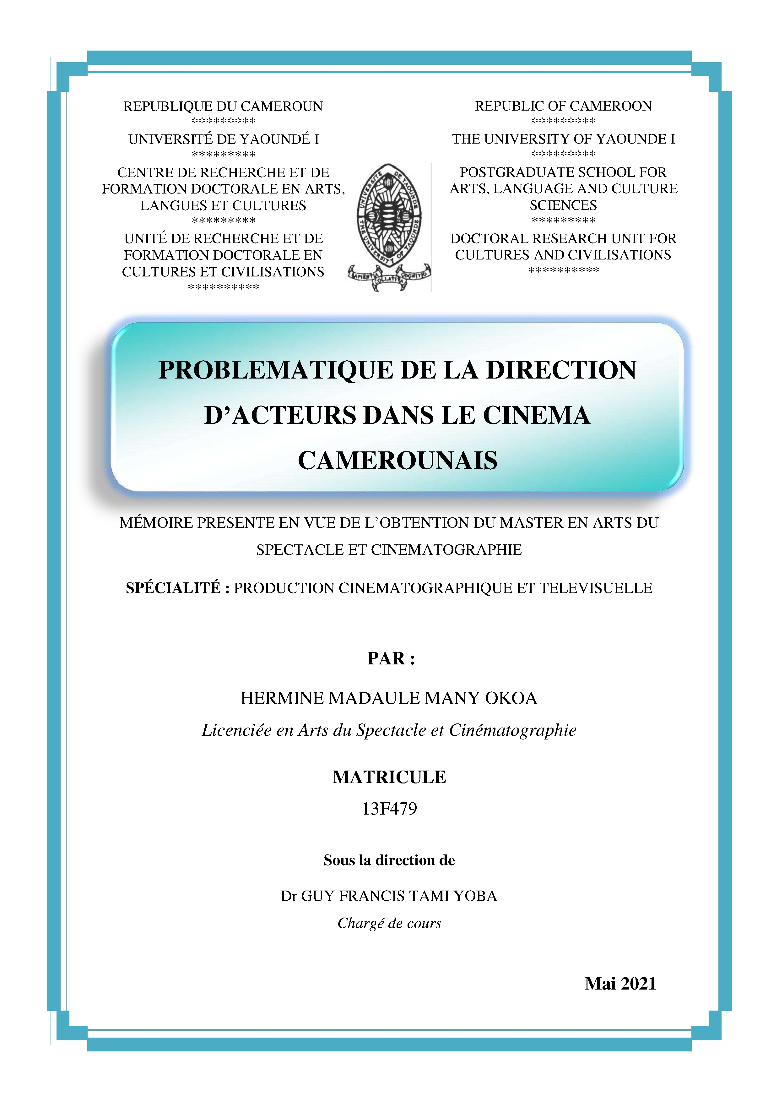 Dans le cadre de ce mémoire, il est question de montrer que : la qualité du jeu d’acteur approximatif qui abonde dans la majorité des films camerounais est imputable à un manque de formation solide en actorat ; et surtout à une absence de maîtrise des techniques de direction d’acteurs par la plupart des réalisateurs. Le problème de cette recherche naît donc du constat d’un ensemble de difficultés constituant un obstacle à un meilleur exercice de la direction d’acteurs dans le cinéma camerounais. Pour mieux aborder ledit problème, trois questions de recherche ont été formulées. Des réponses à ces questions ont donné lieu à la formulation des hypothèses de recherche. Et dans le but de confirmer la véracité desdites hypothèses, le mémoire a adopté un cadre théorique et méthodologique qui a convoqué respectivement les études descriptive, historique, comparée et analytique. Quant aux méthodes de collecte de données, elles étaient essentiellement constituées des interviews, des questionnaires, de l’observation participante, du visionnage et analyse des films, de la recherche documentaire et bibliographique. Il a ainsi découlé du cadre théorique et méthodologique un plan composé de cinq chapitres. Dans le premier chapitre qui s’intitule : « La notion de direction d’acteurs au cinéma », il était question de décrire les origines et manifestations de la direction d’acteurs au cinéma, ainsi que les différents styles de jeu d’acteur. Quant au deuxième chapitre qui a pour titre : « Origines du cinéma camerounais et techniques de réalisation de quelques figures marquantes », il jette un bref regard diachronique sur l’histoire et l’évolution du cinéma camerounais ; ainsi que sur le parcours de certains réalisateurs considérés comme figures marquantes de notre univers cinématographique. Le troisième chapitre intitulé : « Etude comparée sur la direction d’acteurs dans le cinéma camerounais » se consacre à une étude comparative sur la direction d’acteurs dans le cinéma camerounais. Et le quatrième chapitre qui s’intitule : « Regard critique sur la direction d’acteurs dans le cinéma camerounais » s’évertue à jeter un regard critique sur les causes profondes des manquements caractérisant l’exercice de la direction d’acteurs dans le cinéma camerounais; et les conséquences de ces dysfonctionnements sur la carrière des acteurs et les produits filmiques. Enfin, le cinquième chapitre intitulé : « Description d’un cas modèle de formation en direction d’acteurs, et suggestions pour une meilleure pratique de cette activité technico-artistique dans le cinéma camerounais » propose un cas modèle de direction d’acteurs et des mesures fortes à l’effet de repenser l’exercice de cette activité technico-artistique dans l’univers du septième art