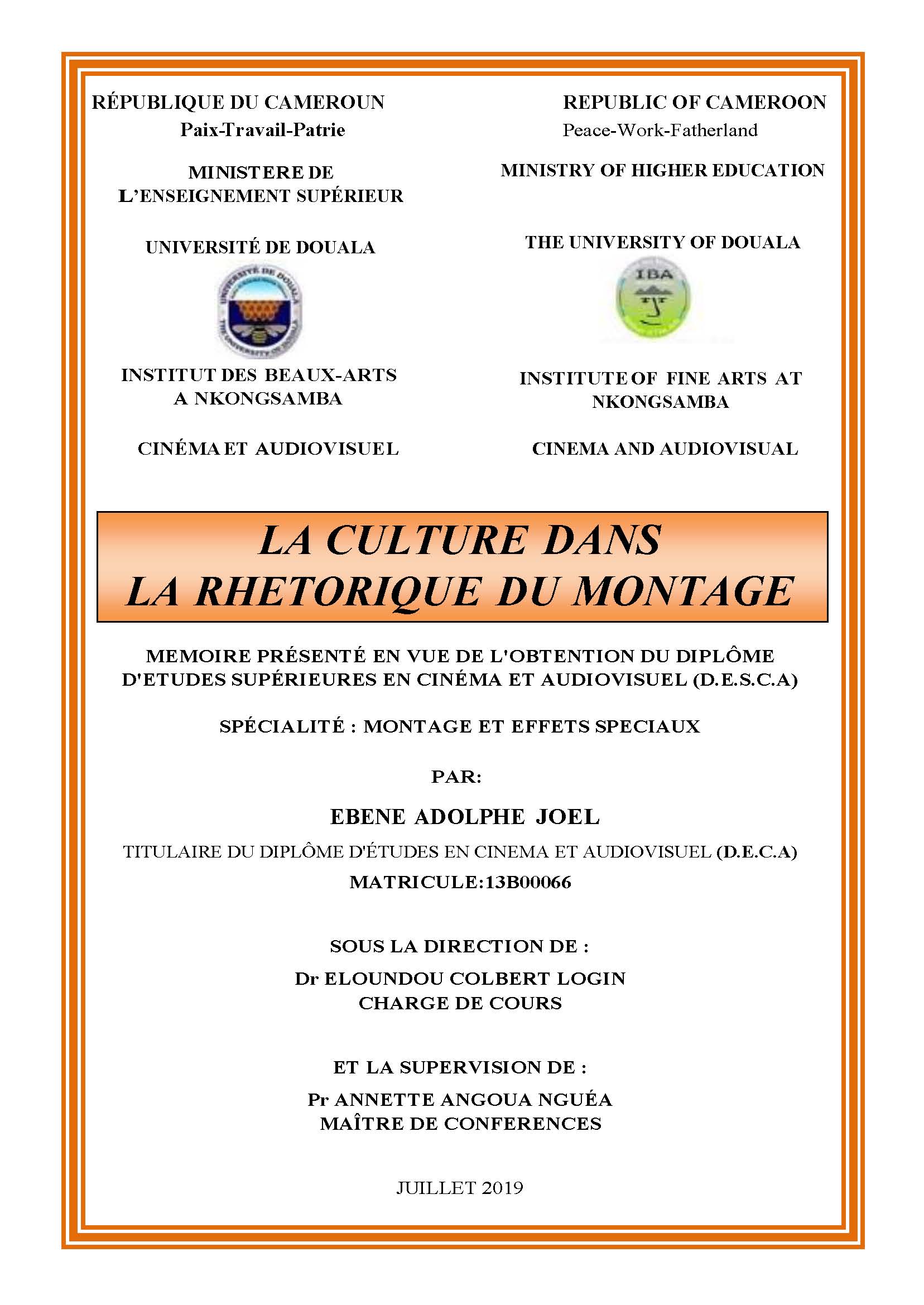 Le présent mémoire porte sur la place de la culture dans la rhétorique du montage. Ce travail vise à démontrer comment les éléments culturels africains embellissent et enrichissent le montage des films dans le but de mettre en valeur une nation ou un peuple donné. De ce fait, nous nous appuierons sur deux approches, à savoir l’approche esthétique pensée par Marie Thérèse JOURNAU et l’approche sémiotique tirée de la thèse de Longin Colbert ELOUNDOU. Il en ressort que la culture d’un peuple au travers le montage cinématographique et audiovisuel, laisse découvrir son authenticité, son originalité et même son identité. Elle renseigne sur les habitudes des peuples, leurs modes de vie, etc. De même, dira-t-on : « il n’y a pas de peuple sans culture ». Tout cela nous remet au coeur des divergences et diversités culturelles humaines et permet aussi de comprendre les réalités des vie humaines dans d’autres bouts du monde. Ceci avec le meilleur choix des bons décors, des bons maquillages, la sélection des meilleurs plans à utiliser suivant les époques données, les meilleurs costumes selon les circonstances et bien d’autres éléments de choix.
