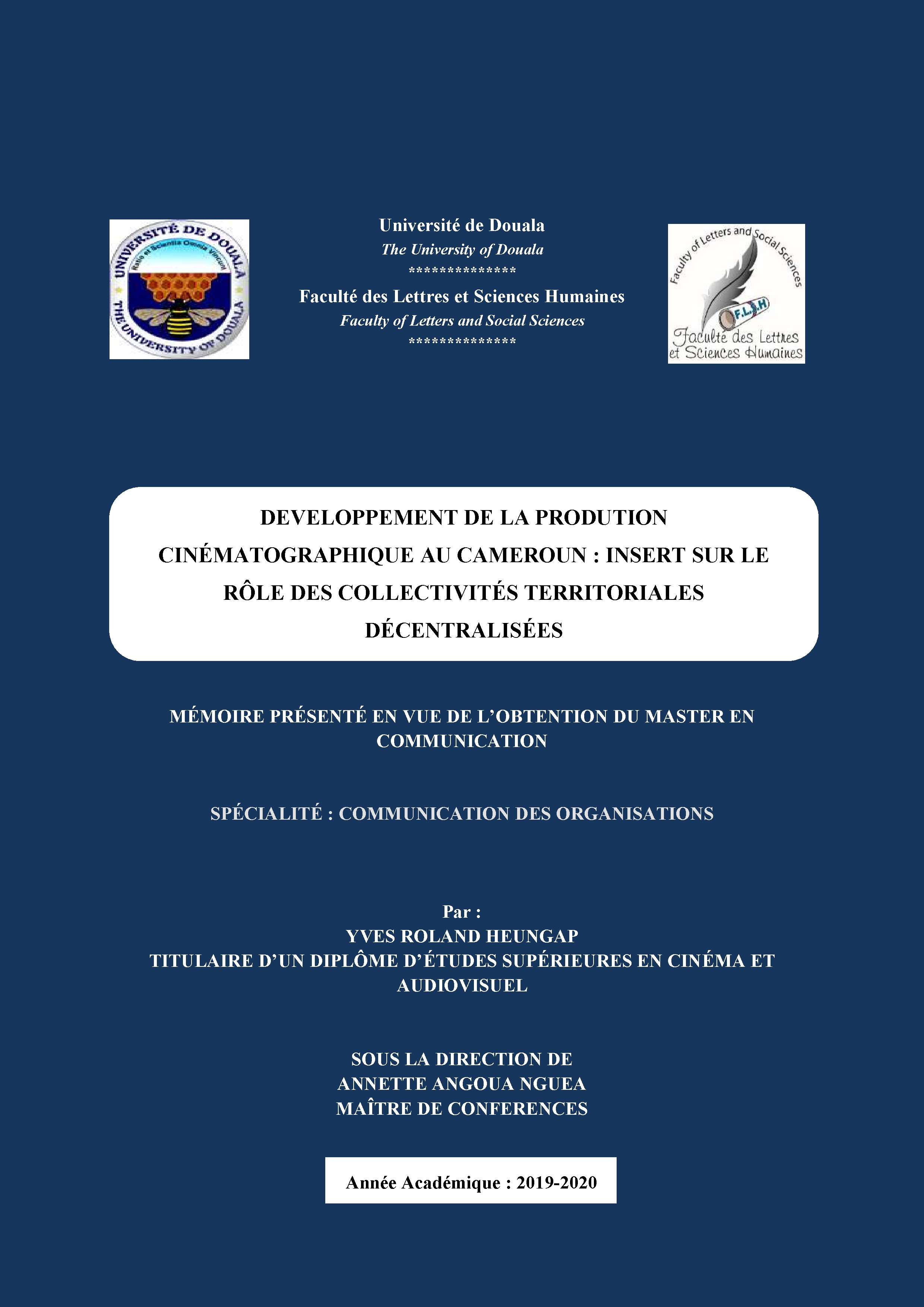 Ce mémoire porte sur le développement mutuel des industries cinématographiques et les collectivités territoriales décentralisées au Cameroun, en d’autres termes, il est question d’explorer la réciprocité féconde qu’il peut y avoir entre le développement de l’industrie cinématographique d’une part et son incidence sur les ressources desdites collectivités et le bonheur des populations d’autre part. Il pose à cet effet le problème de l’impact que peut avoir le développement de l’industrie cinématographique sur la performance des CTD en rapport avec leur mission principale qui est l’amélioration des conditions de vie de leurs populations. De cette question découlent trois autres : la question de la place de la culture en général et celle du cinéma en particulier dans la planification des CTD ; celle du niveau d’implication des CTD du Wouri dans le soutien du cinéma et sa considération comme un levier potentiel pour un développement local durable ; enfin, la question des mesures à prendre pour tirer davantage parti du potentiel lié au développement du cinéma. Ce travail repose sur plusieurs hypothèses, notamment d’une part celle selon laquelle la culture en général et le cinéma en particulier n’occupe pas une place de choix dans la planification des CTD, et d’autre part celle selon laquelle les CTD ne misent pas suffisamment sur la culture et le cinéma comme activité génératrice de revenu, en particulier dans les communes du Wouri, pour le développement de leur communauté et le bien-être des populations. Pourtant aujourd’hui, il est incontestablement établi que la culture de manière générale et le cinéma en particulier sont des leviers de développement. Ce travail revêt un double objectif. Dans un premier temps, il entend montrer comment les industries cinématographiques peuvent accompagner les CTD dans leur quête d’un développement durable et comment celles-ci peuvent faciliter l’industrialisation du cinéma. Dans un second temps, il entend dégager la place des CTD dans l’évolution administrative du Cameroun et le rôle qui leur est dévolu par le législateur. Pour y parvenir, nous avons opté pour une triangulation théorique, nous inspirant de l’historisme, de la théorie environnementaliste et néo-libérale. Du point de vue méthodologique, nous nous sommes servis de la méthode de développement participative, de la recherche documentaire et des entrevues semi-structurées. C’est ainsi que nous sommes parvenus aux conclusions suivantes : la pratique de la décentralisation au Cameroun est antérieure à son accession à l’indépendance et est rendue aujourd’hui presqu’à sa maturation dans l’attente de la mise en place des conseils régionaux ; l’objectif principal de la décentralisation au Cameroun est la promotion du développement, de la démocratie et de la bonne gouvernance au niveau local ; les compétences d’ordres économique, sanitaire social, éducatif, sportif et culturel sont reconnues aux CTD par le législateur, mais malheureusement en matière culturelle, le législateur ne fait pas explicitement mention des industries cinématographiques ; le cinéma occupe une portion marginale dans la planification des CTD dans le Wouri ; enfin, le cinéma comme levier de développement local durable est déjà expérimenté dans plusieurs pays au monde, notamment au Canada et en Italie. Aussi, pour un développement efficient de l’industrie du film au Cameroun en général et au niveau local en particulier, plusieurs mesures devront être prises aux niveaux national, régional et communal.