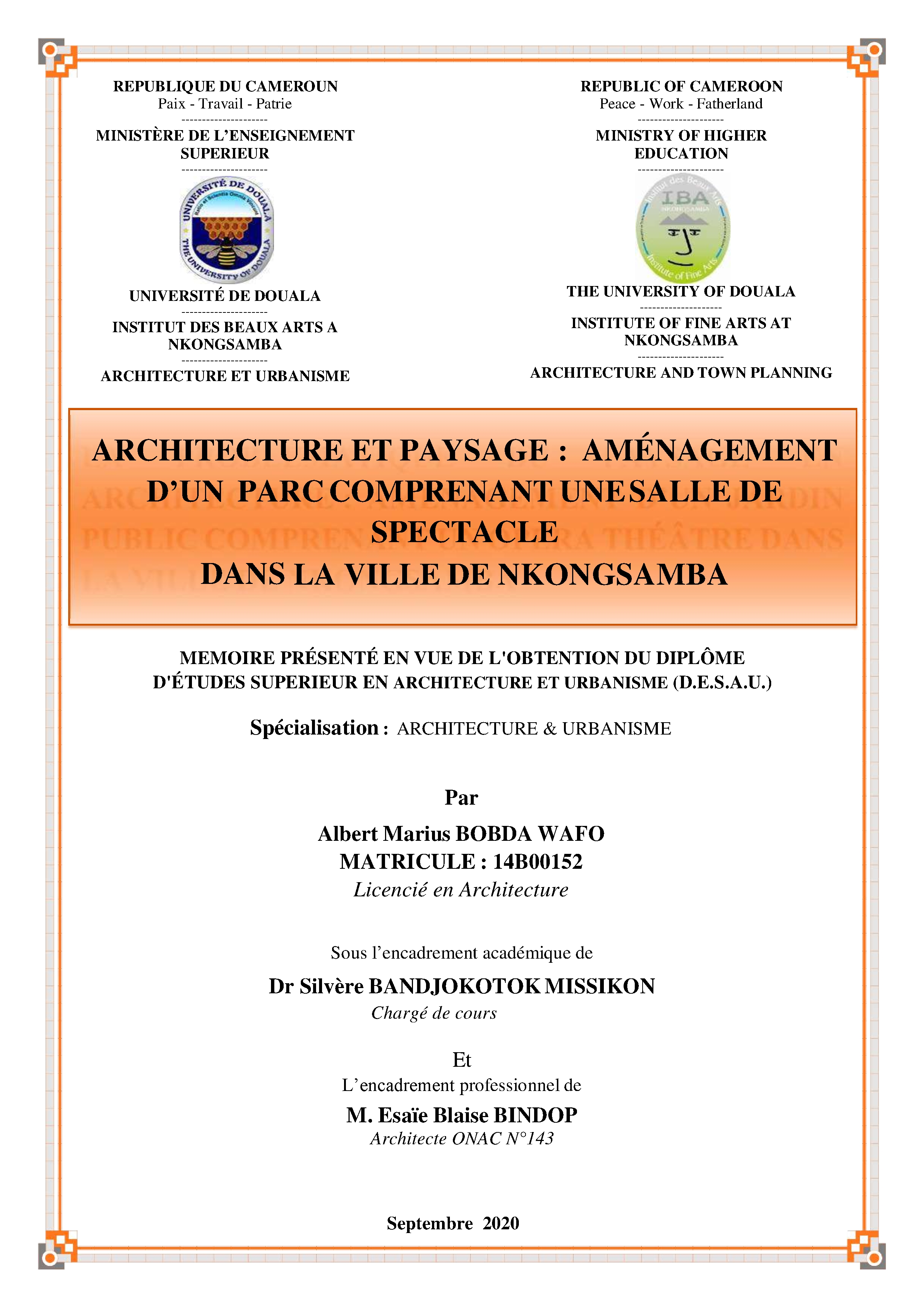 Architecture Et Paysage : Aménagement D’un Parccomprenantunesallede Spectacle Dans La Ville De Nkongsamba (2020)