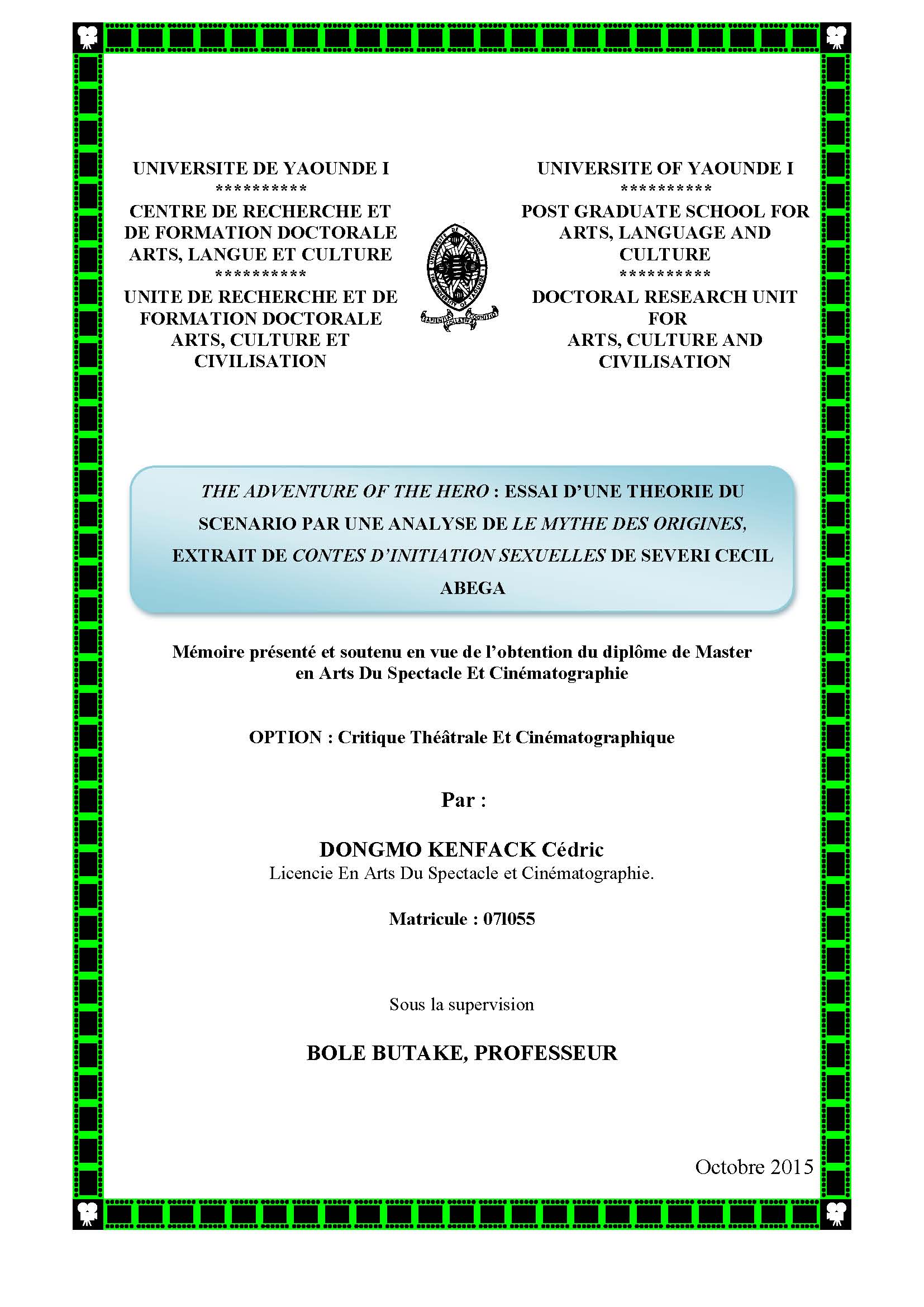 La structure présente pour le scénario un outil efficace en ce qui concerne la préparation voire la planification de l‟écriture. Lorsqu‟il s‟agit de raconter une histoire qui traite de l‟action anthropique The Adventure of the Hero se présente comme un outil de premier choix, du fait de sa qualité essentielle à détailler toutes les étapes comprises dans l‟action anthropique. Il est donc question dans ce travail d‟exploiter la relation qui existe entre la structure de l‟action anthropique telle qu‟elle est développée dans The Adventure of the Hero et la structure du scénario telle qu‟elle est présentée dans le paradigme de Syd Field et les théories suivantes. Ce travail de recherche qui porte sur la question de la structuration du scénario part d‟une préoccupation qui depuis Aristote, ne cesse de faire couler de l‟encre. En effet, le drame qui est le lieu où se raconte le mieux l‟action anthropique nécessite pour sa construction la disposition des outils parmi les quels la structure dramatique. C‟est ainsi que ce travail va porter sur la mise en place d‟un modèle de structure de scénario qui pourra servir d‟instrument pour la mise en place du fil conducteur de l‟intrigue. A partir de The Adventure of the Hero, il s‟agit dans le cadre de ce travail de faire une analyse littéraire de Le mythe des origines de Séverin Cécil ABEGA dans le but de faire ressortir les articulations de l‟action anthropique inhérent à tout processus de quête, puis de partir de là pour mettre en place un modèle de structure de scénario conformément aux normes qui sous-tendent le drame. Dans la mise en oeuvre de cette entreprise, il s‟agit donc faire une présentation de The Adventure of the Hero, et de Le mythe des origines, de faire une présentation des grandes théories de la structure du drame à savoir les théories sur la structure en dramaturgie et les théories sur la structure au cinéma une analyse des deux ouvrages sus cités.