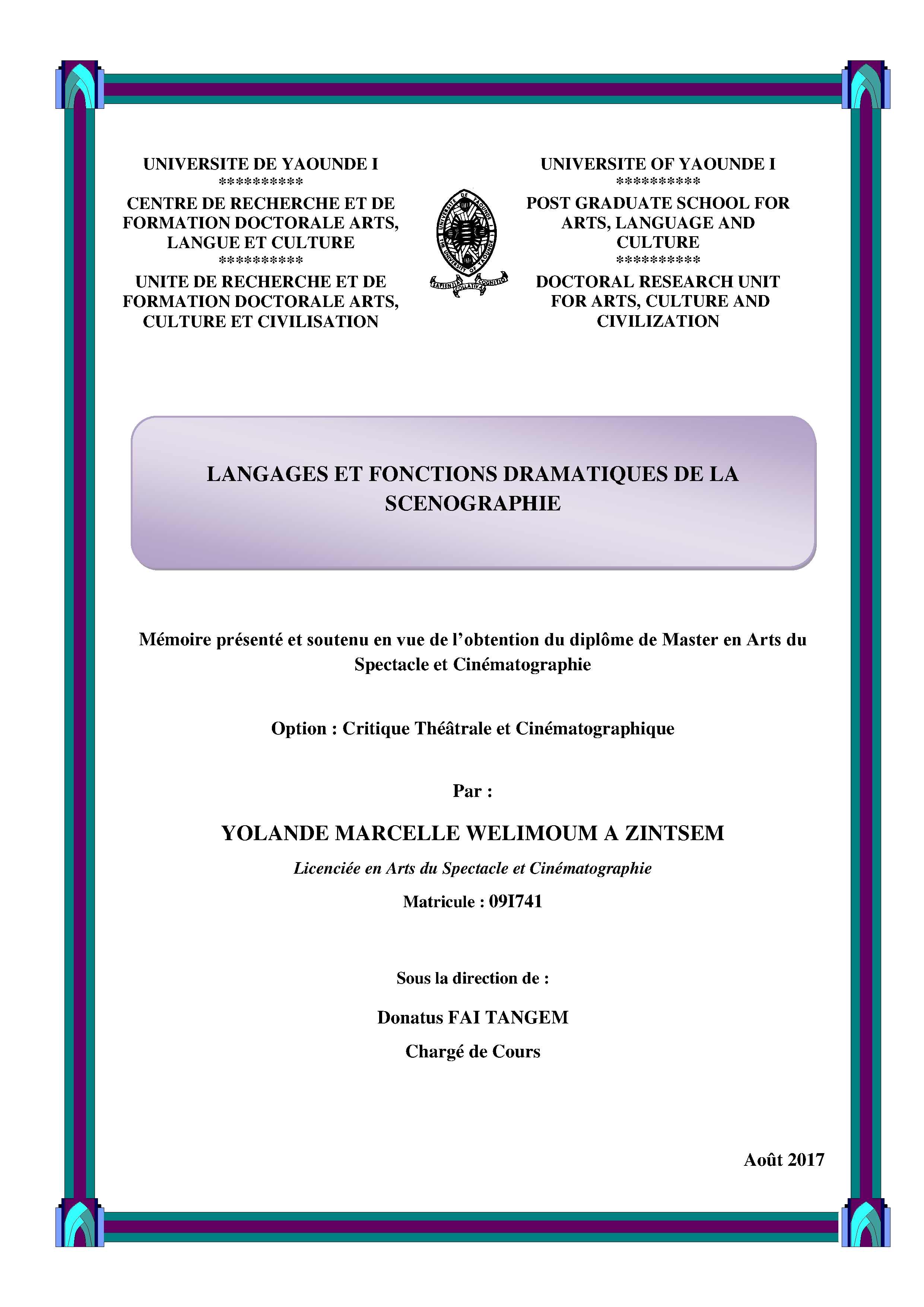 La présente recherche qui s’articule autour de la thématique « Langages et fonctions dramatiques de la scénographie » surgit d’un constat selon lequel l’univers théâtral camerounais reste depuis des décennies en marge des révolutions scéniques observées dans le monde en ce qui concerne la mise en scène et la scénographie théâtrale. Ainsi, ce travail cherche à résoudre la problématique du langage scénographique et de sa place significative dans les spectacles théâtraux camerounais. Pour ce faire, nous avons ressorti une hypothèse principale selon laquelle la scénographie, en tant que code de représentativité théâtrale, regorge de fonctions et significations particulières dont la maitrise de leur agencement scénique pourrait redorer l’activité théâtrale camerounaise, en termes de discours scénique favorisant ainsi sa réception et sa consommation. Cependant, nous allons explorer un cadre théorie pluriel notamment la sémiologie qui englobe dans ce cas précis la théorie de la réception et celle de l’analyse des spectacles ; mais aussi la théorie fonctionnaliste afin d’élucider le fonctionnement des signes dans la mise en scène théâtrale. Pour ce faire, quatre chapitres feront la quintessence de ce travail.
