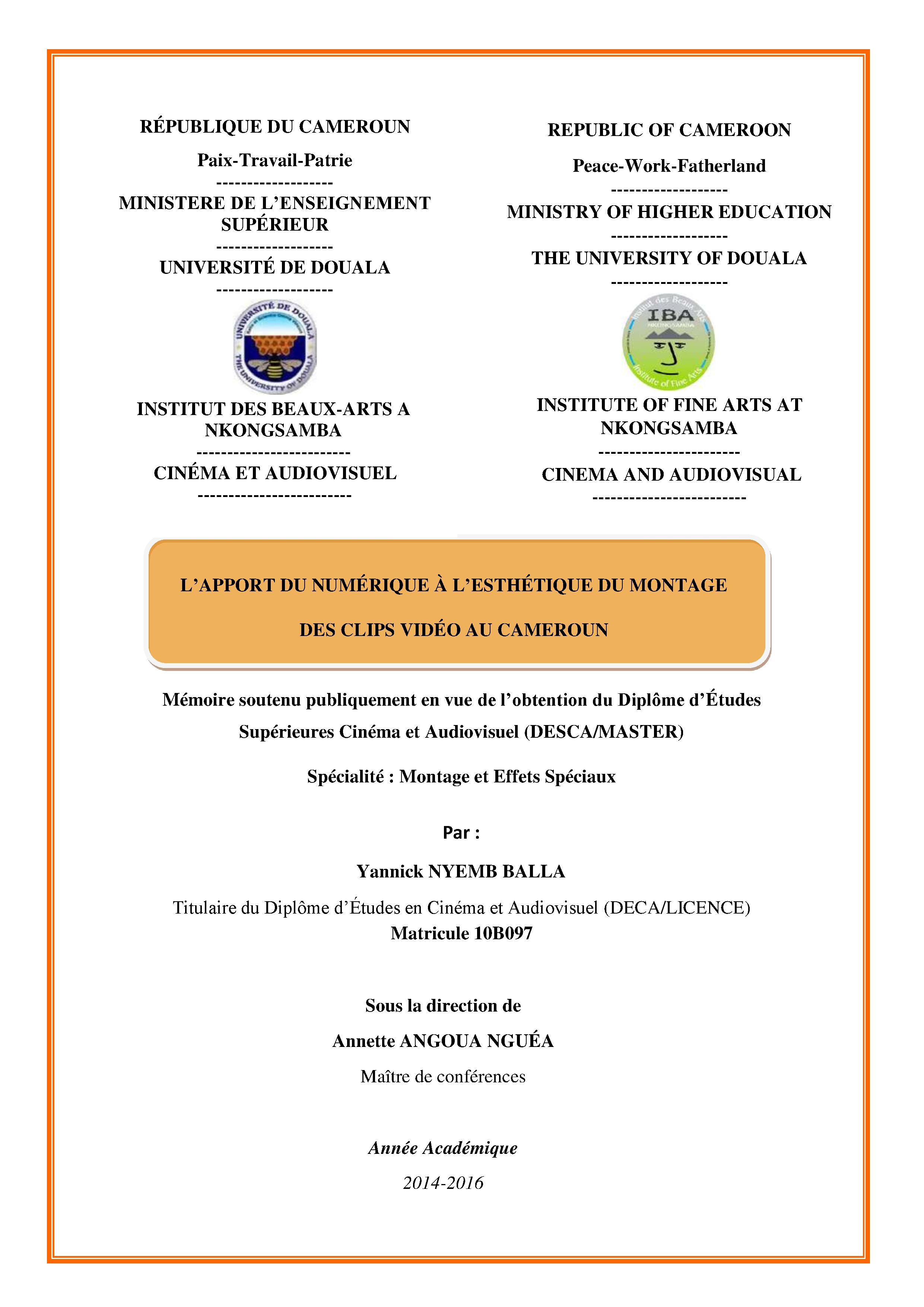 Ainsi, le déterminisme technologique développé par Andrew Feenberg, l'esthétique du film de Jacques Aumont et al., et l'approche esthétique du montage selon Vincent Amiel constituent notre cadre théorique. Méthodologiquement, nous procédons par le visionnage des clips qui permet de prendre connaissance des contenus afin de faciliter l'analyse, les ouvrages sur le montage permettent de soutenir notre analyse; et des entretiens semi-directifs. Cette étude nous amène finalement à démontrer concrètement que le numérique modifie considérablement l'esthétique du montage des clips camerounais; ensuite, à ressortir les différents éléments du numérique qui, dans leur utilisation modifient positivement ou négativement l'esthétique du montage des clips; et enfin, proposer un projet artistique qui serait une sorte d'équilibre entre le choix d'éléments qu'apporte le numérique à l'esthétique du montage et leur utilisation dans un projet pratique.