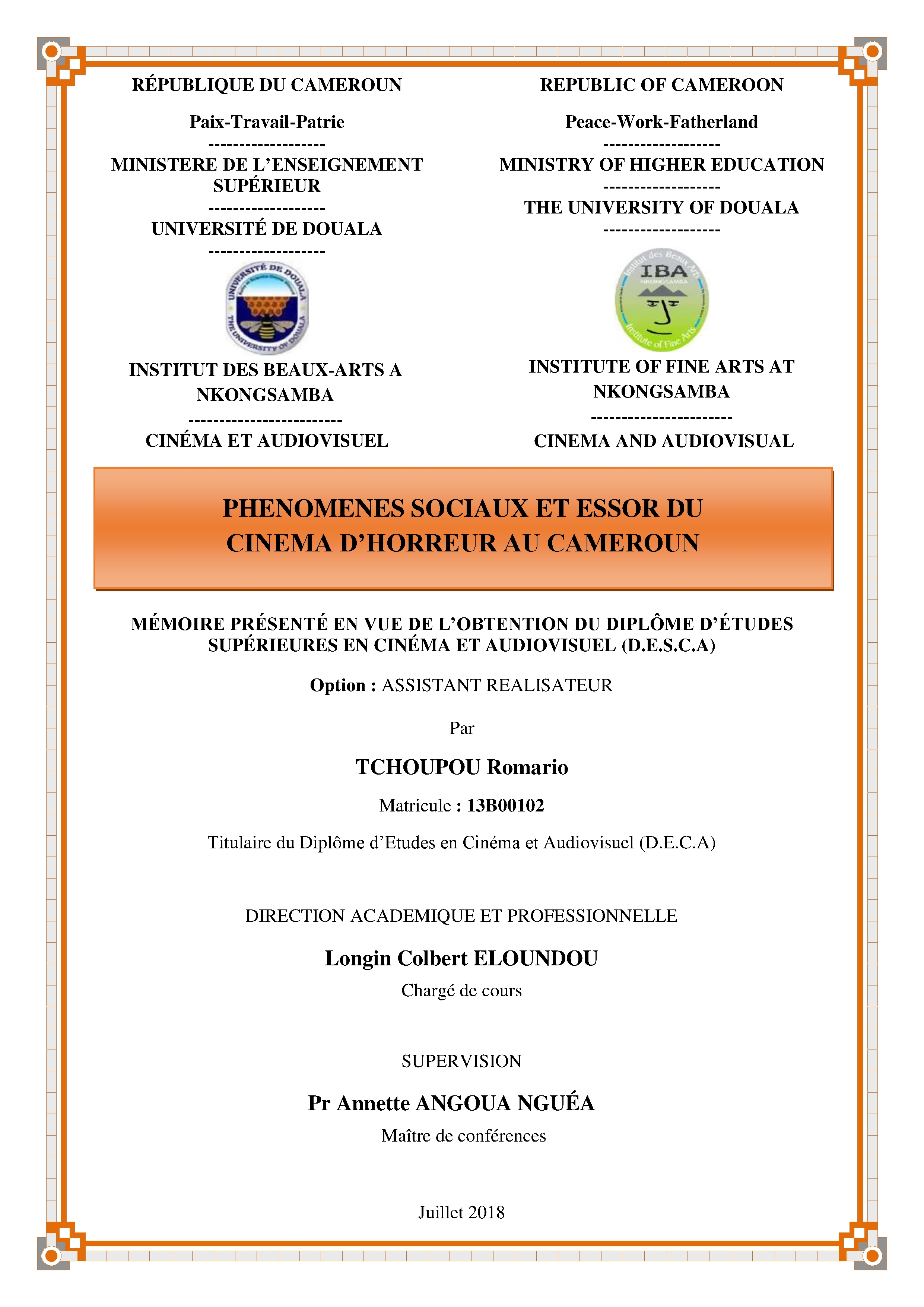 The objective is to propose and orientation which can permit Cameroonians film-makers to approach a notion of horror films in their production; in particular, using horror method. Semiotic-Narratology approach is used to make study on a society and the horror films structure. Semiotic and esthetic approach are also used to understand the quality of horror films and his public effects. These methods have permitted make a horror film. That film prove that, thought Cameroonian’s social phenomenon can equip film-makers in the production of the horror films. By it, increase the quality and Cameroonian's cinema level.