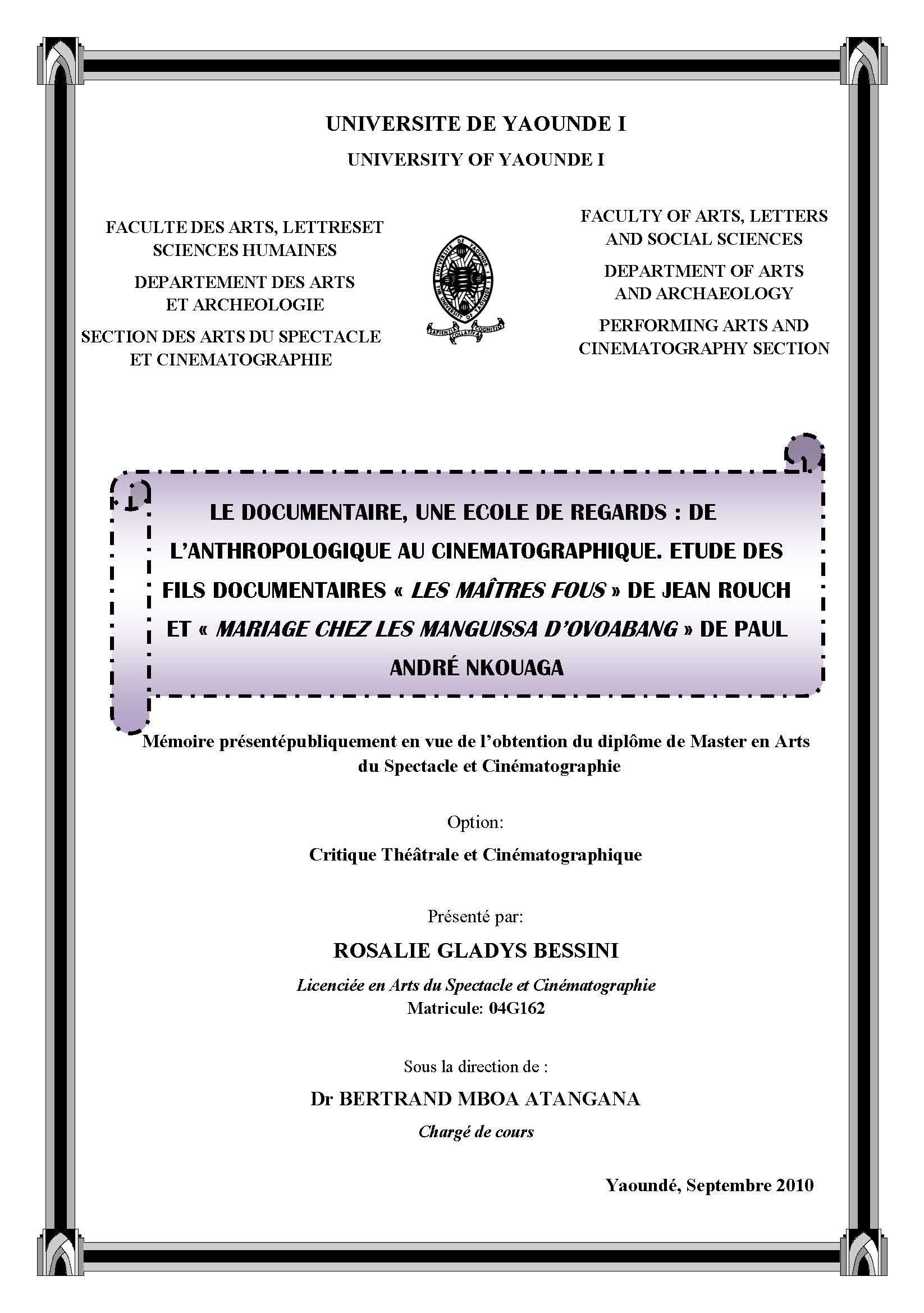 Le documentaire, une école de regards : de l‟anthropologique au cinématographique. Étude des films documentaires Les Maîtres fous de Jean Rouch, et Mariage chez les manguissa d’Ovoabang de Paul André Nkouaga est une étude basée sur les analyses contextuelles et structuro- narratives des films sus-cités, dont la problématique est la diffusion des images mitigées de l‟Afrique à travers les chaînes de télévision et les salles de cinéma. Ces images n‟ont pas laissé indifférents certains cinéastes africains qui clament « la fausseté » de ces dernières. Il se soulève ainsi le problème du décalage entre les images des films documentaires et les contextes sociaux. L‟approche de l‟ethno- perspective amène à une conclusion partielle qui démontre que le décalage noté est le fait de la culture des auteurs- réalisateurs, et d‟autres éléments connexes à la production d‟un film documentaire à savoir : la censure, le financement, et la dépendance culturelle.