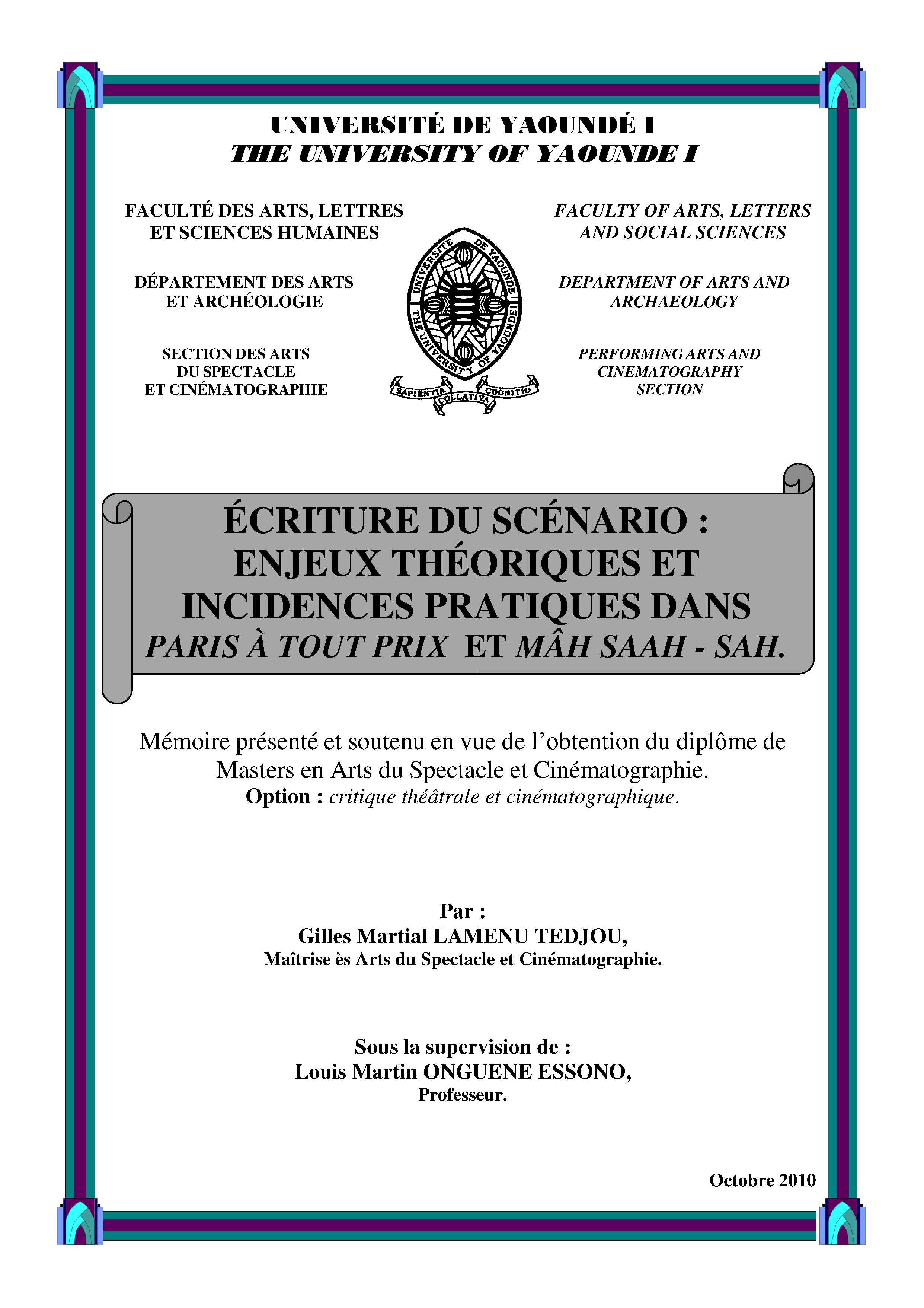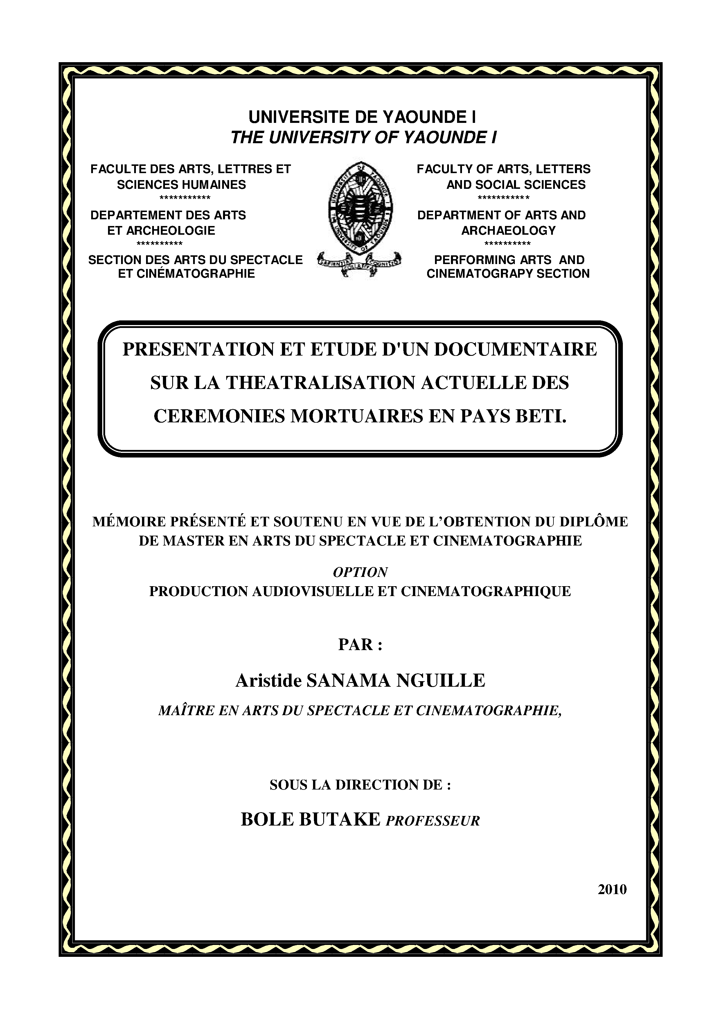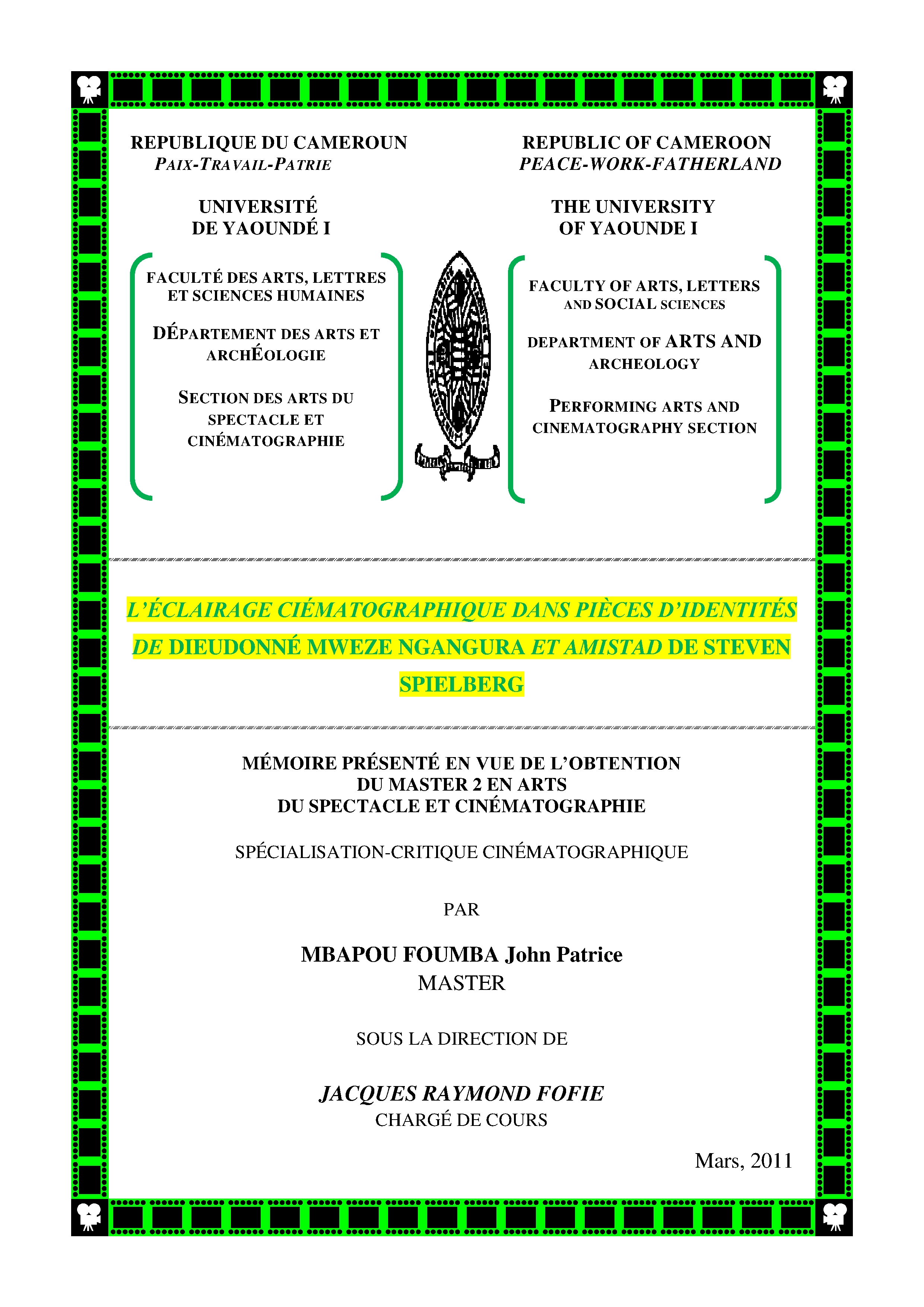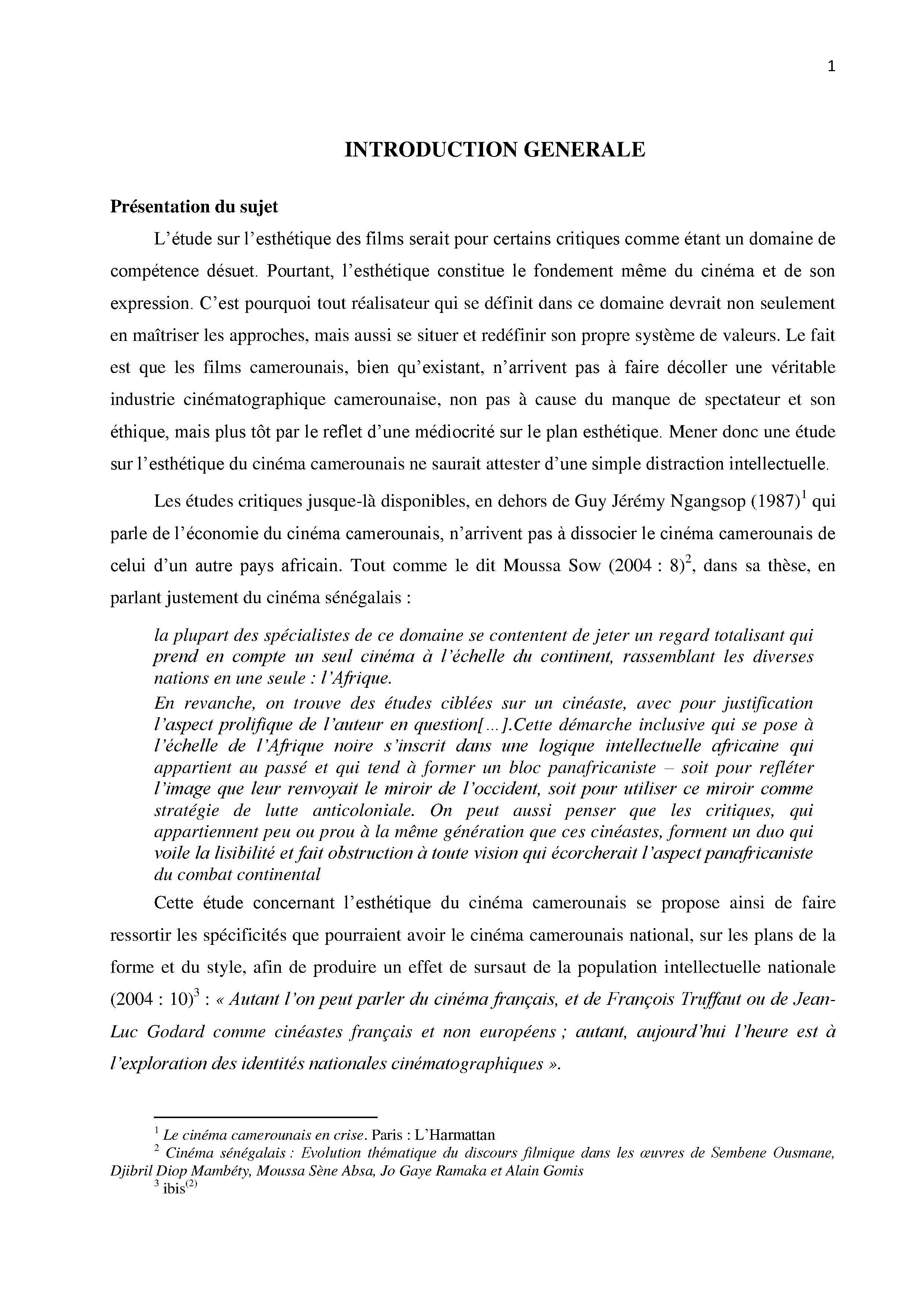 "Ce travail évoque la réalisation non pas sur le plan des techniques filmiques, mais beaucoup plus du point de vue spécifique de l'esthétique de l'auteur. Il est question de partir d'une étude des œuvres filmiques camerounaises qui ont gagné des meilleurs prix au Festival panafricain du cinéma et de la télévision de Ouagadougou (FESPACO) et de faire une analyse sémiologique qui permet de mettre en lumière le design visuel, le design sonore, le design rythmique, les motifs utilisés et le style, afin de questionner les caractéristiques propres à une esthétique du cinéma camerounais.